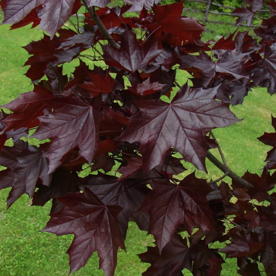 Дерево высотой до 9 м с широкой овальной кроной. Через 10 лет высота и ширина 4-5 м. В штамбовой форме высота зависит от места прививки. Листья до 10 см, 5-лопастные, с заострёнными зубчато-выемчатыми лопастями, весной и летом тёмно-фиолетовые, блестящие, осенью багрово-красные.