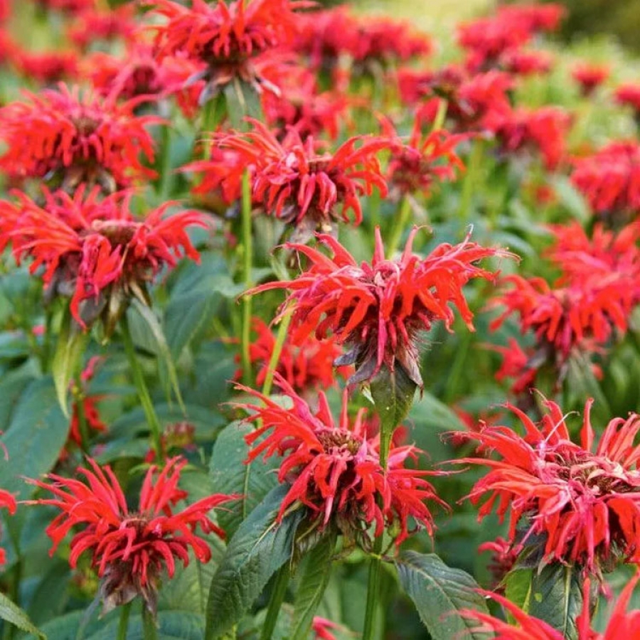 Монарда трубчатая гибридная. Американская селекция. Высота 120-140. Очень крупные, шокирующие красные соцветия, образованные экстрадлинными трубчатыми цветками, темно-пурпурные прицветники. Стебель ветвистый. Устойчива к мучнистой росе.