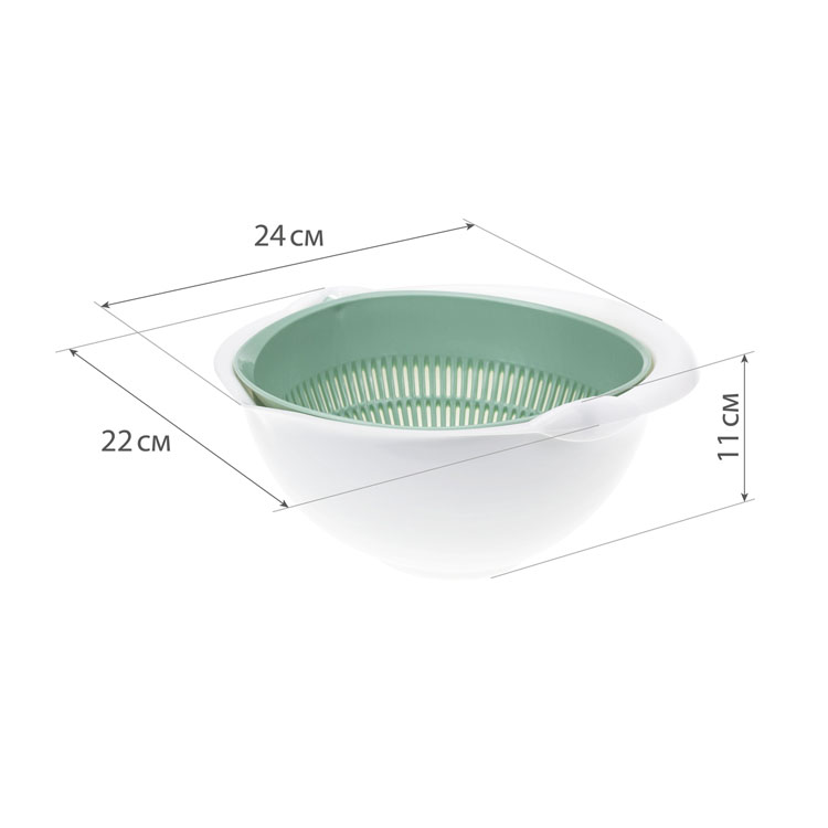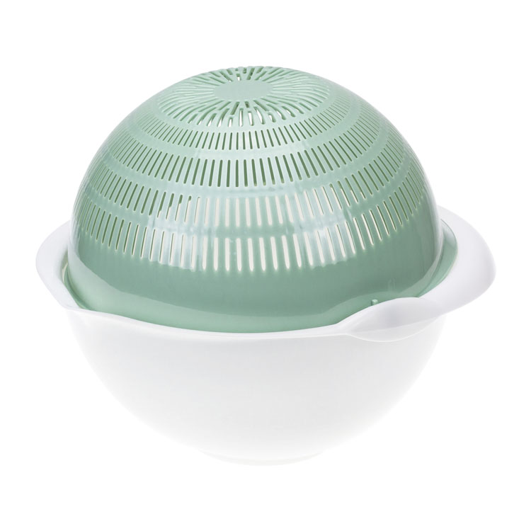 - Эргономичный дизайн и удобная сферическая форма обеспечивают удобство в использовании миски-дуршлага. С ней вы сможете не только промывать продукты, но сушить их, перемешивать, подавать на стол и даже размораживать.