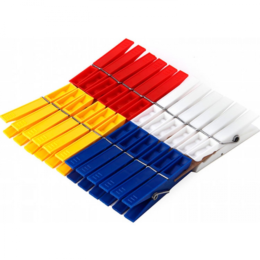 В набор входит 24 прищепки по 6 штук красного, желтого, белого и синего цвета. Прищепки закреплены на картоне и упакованы в термоусадочную пленку.