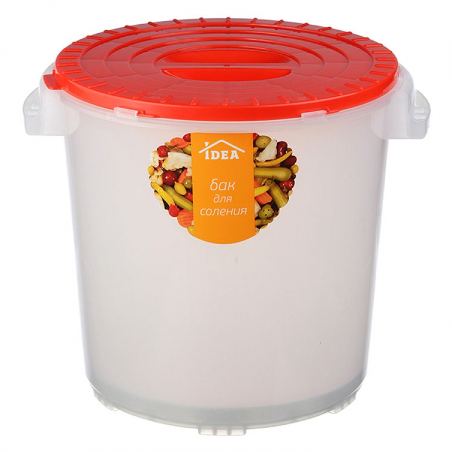Бак состоит из корпуса, крышки и гнета. Крышку можно закрепить легким поворотным движеним до упора. Гнет имеет форму, которая позволяет ставить на него любой груз, в том числе и банку с водой.