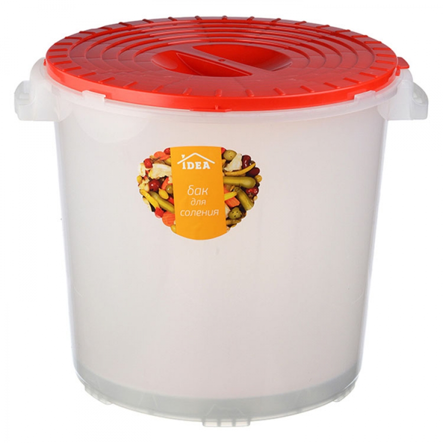 Бак состоит из корпуса, крышки и гнета. Крышку можно закрепить легким поворотным движением до упора. Гнет имет форму, которая позволяет ставить на него любой груз, в том числе и банку с водой.