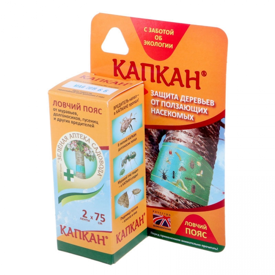 Выпускается в виде ламинированной бумаги и не высыхающего клея. Снижает численность насекомых в кроне дерева, а именно плодовых долгоносиков (яблонного цветоеда, букарки, казарки, вишневого долгоносика) пядениц, кровяной тли, гусениц вишневой побеговой моли, минирующей моли, сливовой плодожорки а также муравьев. Ловчий пояс КАПКАН работает долго и надежно в любую погоду. Применяется пояс путем прикрепления на ствол дерева на расстоянии 40-80 см от поверхности почвы. Использовать рано весной до набухания почек от зимующих в почве вредителей. В течение лета для защиты от гусениц, муравьёв. В конце августа для отлова бабочек пяденицы.