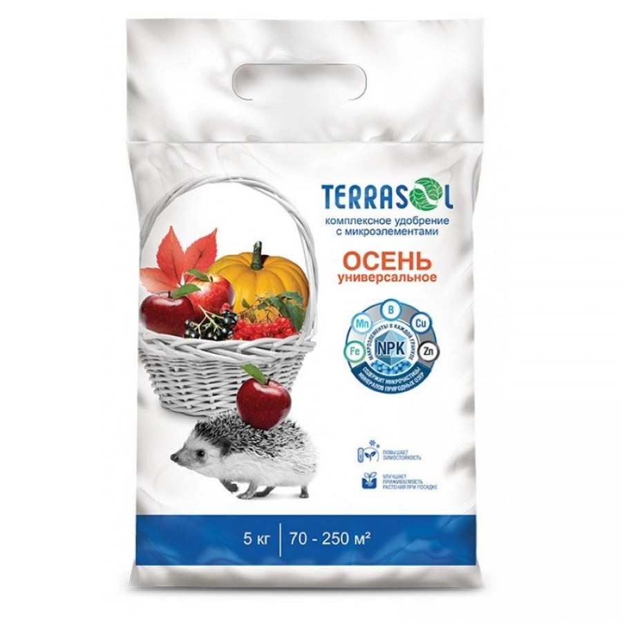 Удобрение сухое Террасол минеральное Осень тукосмесь с микроэлементами – минеральное удобрение комплексного действия. Комплексная добавка отличается без хлорным составом, что благоприятно влияет на рост и развитие растений. Идеальное соотношение элементов питания позволяет применять данное удобрение в качестве основного, при подготовке почвы перед посадкой. Сформировано в гранулу, что ускоряет процесс внесения в почву.