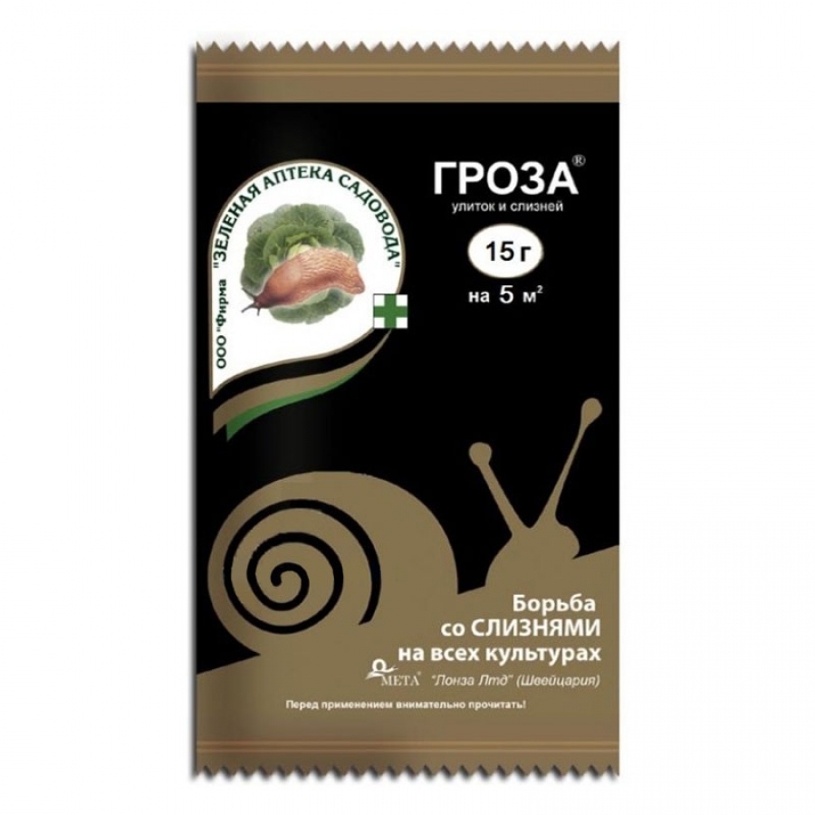 Средство контактно-кишечного действия Гроза в гранулах используется в качестве приманки для борьбы с улитками, слизнями на овощных, плодовых, цитрусовых, ягодных культурах, цветах, винограде. Готов к применению. Разрешено для экологического земледелия (безопасен для дождевых червей и полезных насекомых). Простое применение – гранулы просто рассыпаются на поверхности почвы.