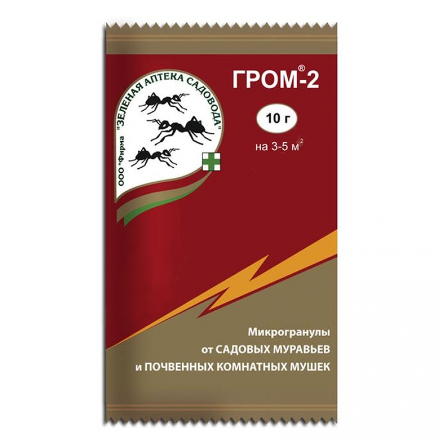 Гром-2 – высокоэффективные микрогранулы. Благодаря гранулированной форме выпуска, защитное действие длится больше месяца, а также такой формат очень удобен. Средство применяют для уничтожения муравьев в цветниках, на грядках, под деревьями. А также оно отлично справляется с почвенными мушками на рассаде и комнатных цветах.