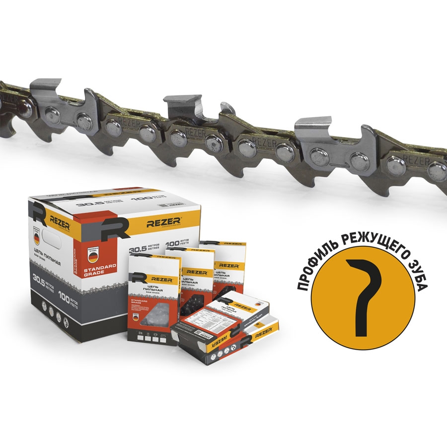 Цепи REZER предназначены для использования на цепных пилах различных моделей и классов. Конструкция средних звеньев способствует снижению вибрации, а конструкция направляющих звеньев обеспечивает дополнительную смазку, что продлевает ресурс пильного аппарата и создает комфортные условия пиления.