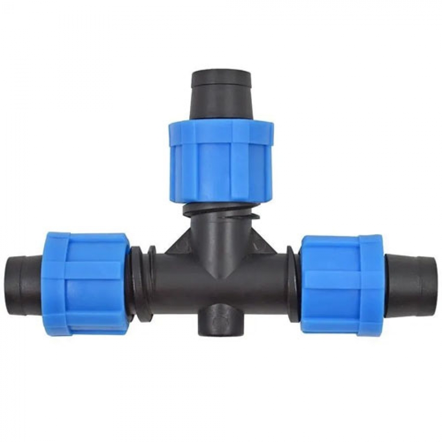 Тройник с зажимными гайками для ленты. Используется для разветвления капельной ленты под углом 90 градусов. Разборное соединение позволяет быстро собрать и разобрать систему полива, например, для сезонного хранения или модернизации.
