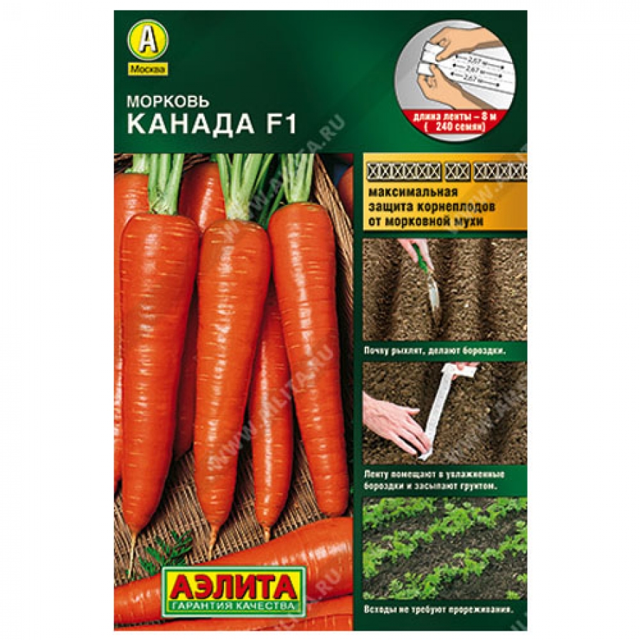 Посев: почву разрыхляют. Ленту помещают в хорошо увлажненные бороздки на подготовленной грядке, на глубину 1,5-2 см и засыпают грунтом, поливают. До появления всходов грядку накрывают пленкой, поддерживая верхний слой почвы во влажном состоянии (не допуская пересыхания ленты). Благодаря идеальному расположению семян на ленте (на расстоянии 3-3,5 см) всходы не требуют прореживания, и растения могут равномерно развиваться. Это сводит к минимуму повреждение корнеплодов морковной мухой, так как ее привлекает запах морковной ботвы, усиливающийся при прореживании. Дальнейший уход заключается в прополках, поливах и рыхлении почвы. Наслаждайтесь сладкой и здоровой морковью со своего огорода!