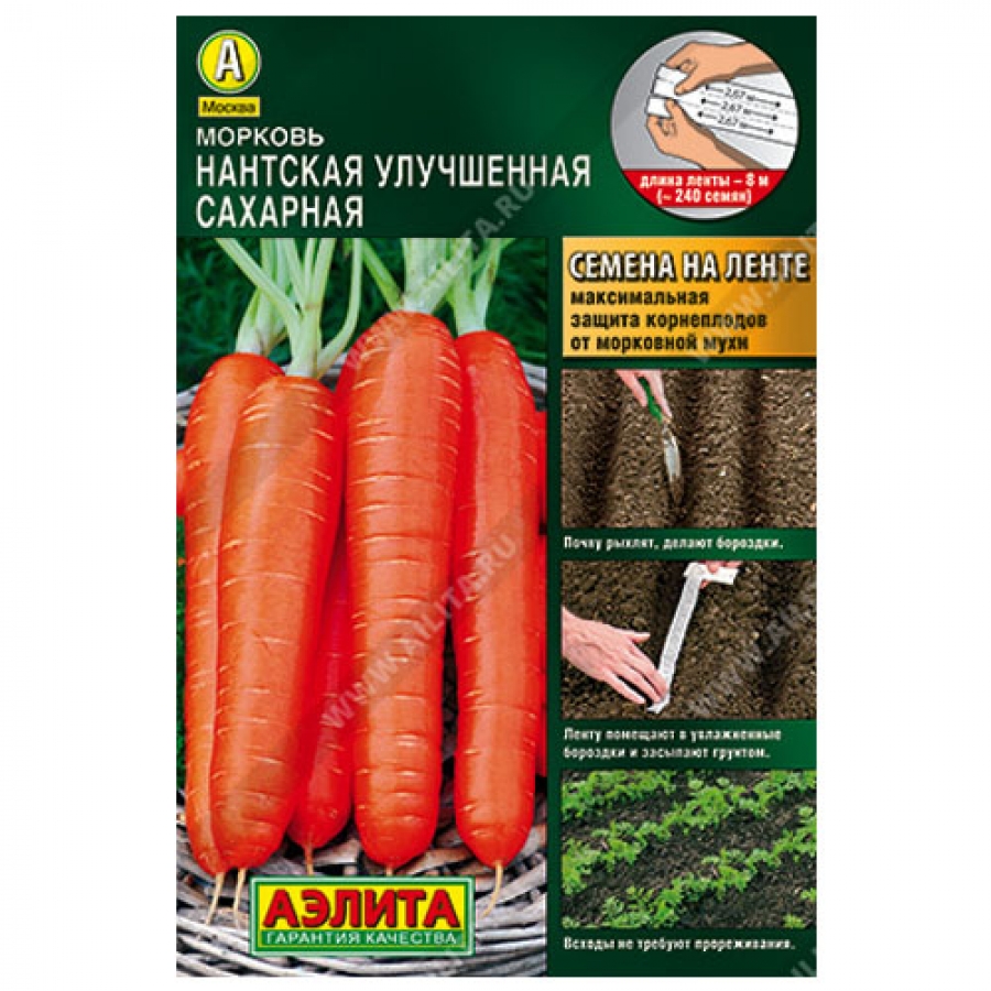 Семена на ленте – очень просто и удобно! Семена тщательно подготовлены к посеву и находятся между двумя тонкими слоями ленты, полностью растворимой во влажной среде. Материал ленты – 100% целлюлоза, не содержит клея. Технология запатентована. Общая длина ленты – 8 м. Лента состоит из трех частей. Перед использованием их нужно отделить друг от друга и расправить. Длина каждой части – 2,67 м. На каждой части располагаются ≈ 80 семян моркови (всего ≈ 240 шт.).