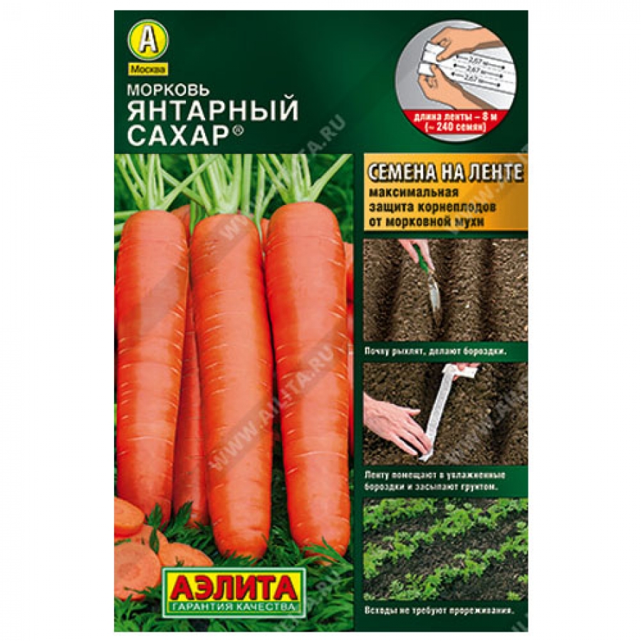 Посев: почву разрыхляют. Ленту помещают в хорошо увлажненные бороздки на подготовленной грядке, на глубину 1,5-2 см и засыпают грунтом, поливают. До появления всходов грядку накрывают пленкой, поддерживая верхний слой почвы во влажном состоянии (не допуская пересыхания ленты). Благодаря идеальному расположению семян на ленте (на расстоянии 3-3,5 см) всходы не требуют прореживания, и растения могут равномерно развиваться. Это сводит к минимуму повреждение корнеплодов морковной мухой, так как ее привлекает запах морковной ботвы, усиливающийся при прореживании. Дальнейший уход заключается в прополках, поливах и рыхлении почвы. Наслаждайтесь сладкой и здоровой морковью со своего огорода!