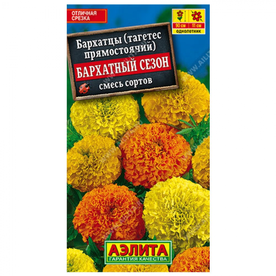 Высокорослые бархатцы с очень крупными (Ø 10-11 см), махровыми соцветиями. Кусты высотой 80-90 см, ветвистые, с большим количеством крепких цветоносов. Раннее, обильное и продолжительное цветение обеспечит саду роскошный вид. Смесь великолепно смотрится в рабатках и на клумбах, подходит для создания массивов. Используется на срезку, сохраняя в воде свежесть и красоту около 2 недель.