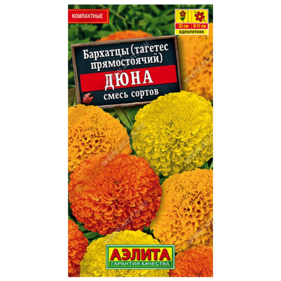 Очаровательная смесь низкорослых, крупноцветковых, раннецветущих бархатцев. Кусты компактные, выравненные по габитусу (высота и ширина около 30 см). Соцветия очень крупные (Ø 9-11 см), яркоокрашенные. Цветение обильное и продолжительное, до заморозков. Соцветия чрезвычайно устойчивы к атмосферной влаге. Густомахровое строение корзинки не позволяет накапливаться воде. Благодаря устойчивости к непогоде кусты прекрасно держат форму и не теряют декоративности. Смесь рекомендуется для бордюрных и групповых посадок в садовых цветниках и контейнерной культуры.