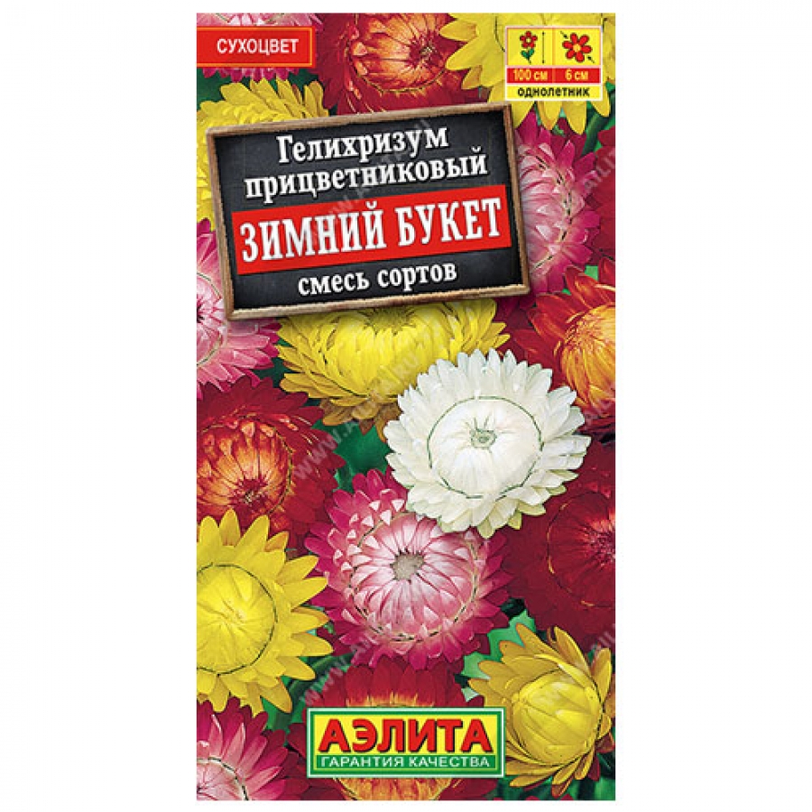 Самый распространенный сухоцвет. Известен также под названиями цмин, бессмертник, иммортель. Эффектный, высокорослый (100 см) летник с яркими, махровыми соцветиями-корзинками Ø 5-6 см, которые имеют пленчатые, «шуршащие» лепестки. Растение обладает терпким ароматом с легкой горечью, как у степной полыни. Летом и осенью кусты отлично украшают цветники. Жесткие соцветия прекрасно выносят летнюю жару. Для зимних букетов их срезают в полуроспуске и подвешивают головками вниз в тенистом месте для сушки.