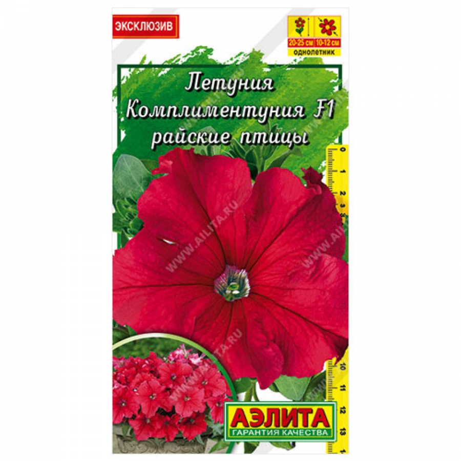 «Давайте говорить друг другу комплименты». Когда трудно подобрать нужные слова, на помощь придут цветы. Комплиментуния F1 ® – стильное, эффектное и очень изящное растение. Это романтичный, практичный выбор и комплимент на языке цветов. Комплиментуния F1 ® – эксклюзивный гибрид (новая петуния) с крупными цветками и суперобильным цветением. Украсит любой цветник и будет долго дарить радость и восхищение. Благодаря наличию гена мужской стерильности семян не завязывает, направляя всю энергию на формирование новых цветков. Форма растений кустовая, со склонностью к трейлингу: ширина больше высоты. Высота 20-25 см, ширина 25-30 см. Быстро разрастается. Растения устойчивы к болезням, выдерживают дождливую и ветреную погоду, переносят кратковременные заморозки до –5°С и экстремальную жару до +40°С без потери декоративности.