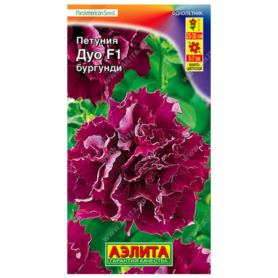Раннецветущий махровый гибрид американской селекции из группы мультифлора от американской компании PanAmerican Seed. Среди махровых петуний нет более неприхотливых и надежных, чем гибриды из серии ДУО F1. Растения прямостоячие, крепкие, хорошо кустящиеся, объемные. Размеры достаточно компактные: высота 25-35 см, ширина 25-30 см. Цветки насыщенного оттенка, Ø 5-7 см. Цветение обильное. По сравнению с крупноцветковыми, гибрид более устойчив к дождям. Отлично подходит для контейнерного выращивания и оформления цветников открытого грунта. Хорошо удается даже у новичков цветоводства.