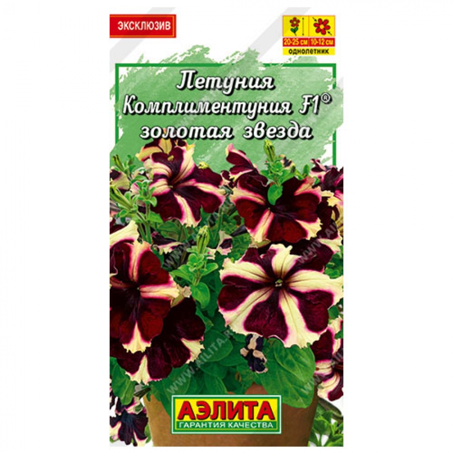 «Давайте говорить друг другу комплименты». Когда трудно подобрать нужные слова, на помощь придут цветы. Комплиментуния – стильное, эффектное и очень изящное растение. Это романтичный, практичный выбор и комплимент на языке цветов. Комплиментуния – эксклюзивный гибрид (новая петуния) с крупными цветками и суперобильным цветением. Украсит любой цветник и будет долго дарить радость и восхищение. Благодаря наличию гена мужской стерильности семян не завязывает, направляя всю энергию на формирование новых цветков. Форма растений кустовая, со склонностью к трейлингу: ширина больше высоты. Высота 20-25 см, ширина 40-50 см. Быстро разрастается. Растения устойчивы к болезням, выдерживают дождливую и ветреную погоду, переносят кратковременные заморозки до -5°С и экстремальную жару до +40°С без потери декоративности.