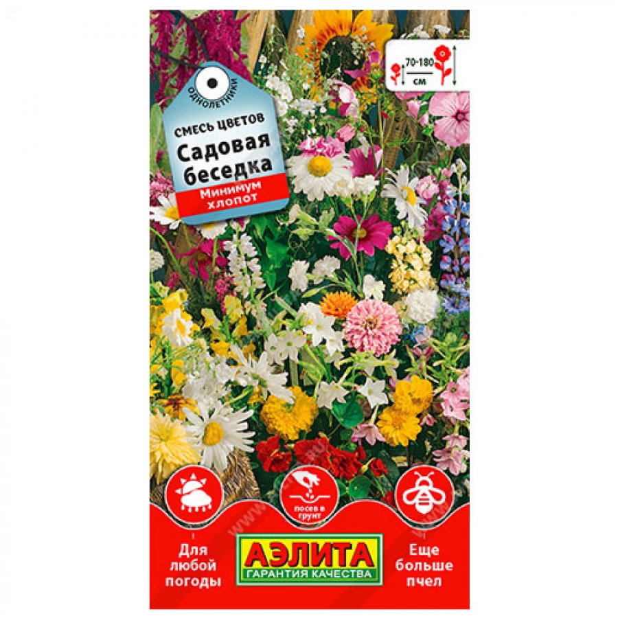 Отличная смесь однолетних цветочных культур для оформления садовых беседок и веранд. Высокорослые и вьющиеся растения, входящие в состав, гармонично сочетаются между собой. Плотно сплетаясь и рано зацветая, образуют роскошную живую изгородь. Минимум хлопот!