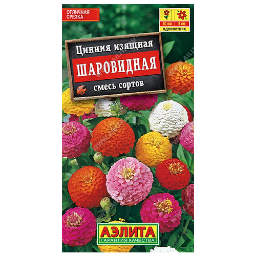 Превосходная смесь помпонной циннии с большой палитрой расцветок. Яркие оттенки не выгорают на солнце. Густомахровые корзинки Ø 6-8 см имеют плотное черепитчатое строение. Кусты высотой 45-50 см и шириной до 30 см, хорошо ветвятся от основания. Продолжительное, обильное и красочное цветение привлекает массу бабочек и мелких птичек. Использование универсальное – оформление цветников, срезка в букеты. Помпонные циннии отлично смотрятся группами на клумбах, лентами в бордюрах, большими массивами.