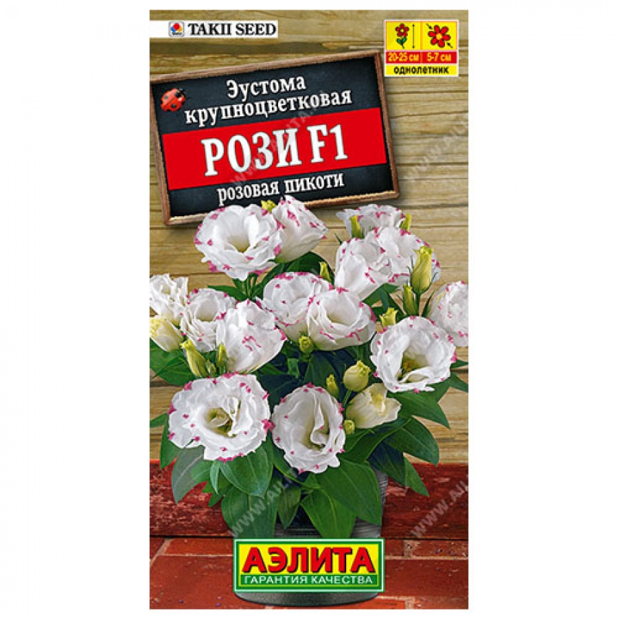 Потрясающе нарядная, генетически низкорослая эустома японской компании Takii Seed! Крупные, диаметром до 7 см, махровые цветки фантастически смотрятся на невысоких (20-25 см) кустиках. Растения отлично ветвятся, не требуя прищипки. Цветение очень длительное, бутоны формируются и распускаются постепенно. В доме эустома может жить 2-3 года, в открытом грунте ее выращивают как однолетник. Первые месяцы растения развиваются крайне медленно. Они не любят травм корневой системы (предпочтительна перевалка, а не пикировка). Уход состоит в своевременных поливах, подкормках и, при горшечной культуре, перевалке в более просторную емкость. Лучше всего растения цветут в легком, рыхлом, воздухопроницаемом грунте с нейтральной реакцией рН.