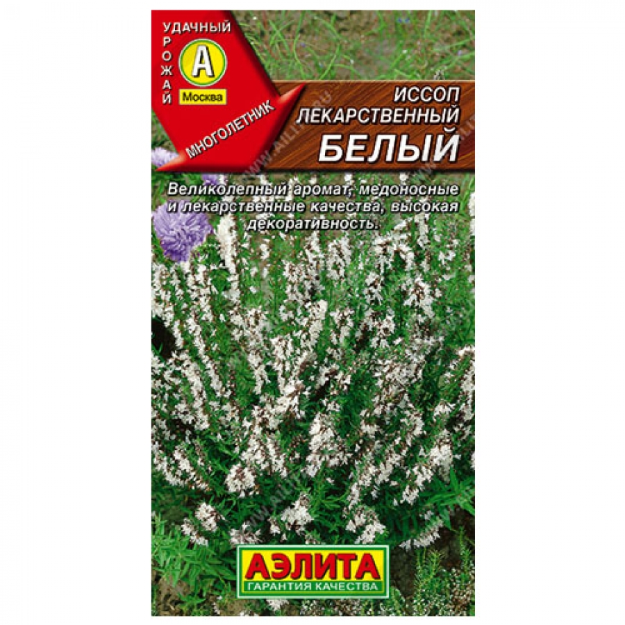 Многолетний полукустарник пряно-ароматической группы. Ценится за приятный интенсивный аромат, высокую декоративность, лекарственные, медоносные и пищевые качества. Сорт раннеспелый, с момента весеннего отрастания до начала цветения 80-85 дней. Формирует плотный куст высотой 50 см. Урожайность зелени 3-3,5 кг/м². Вредителями и болезнями практически не поражается, зимует без укрытия. Листья и молодые побеги используют в свежем и сушеном виде в качестве приправы к разнообразным блюдам. Эфирное масло иссопа обладает антимикробным и противовирусным действием.