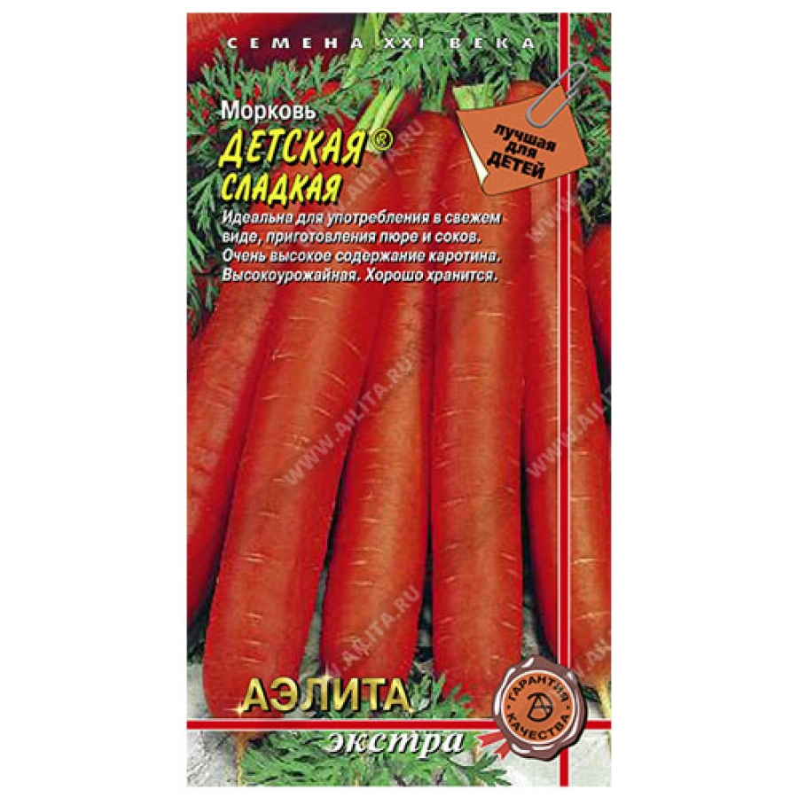 Сорт среднеспелый, высокоурожайный. Корнеплоды цилиндрические, тупоконечные. Сердцевина маленькая, мякоть красно-оранжевая, сочная, нежная, сладкая. Отличается самым высоким содержанием витаминов, каротина и сахара среди среднеспелых сортов. Масса корнеплода 130-200 г, длина 19-21 см, диаметр 2,5-3,0 см, длина ботвы 35-40 см. Корнеплоды очень лёжкие, высоких вкусовых качеств и имеют привлекательный товарный вид. Рекомендуется для потребления в свежем виде, для изготовления высококачественных сладких соков и пюре с повышенным содержанием витаминов – для детей. Компания «АЭЛИТА» является эксклюзивным продавцом семян моркови сорта «Детская ®».