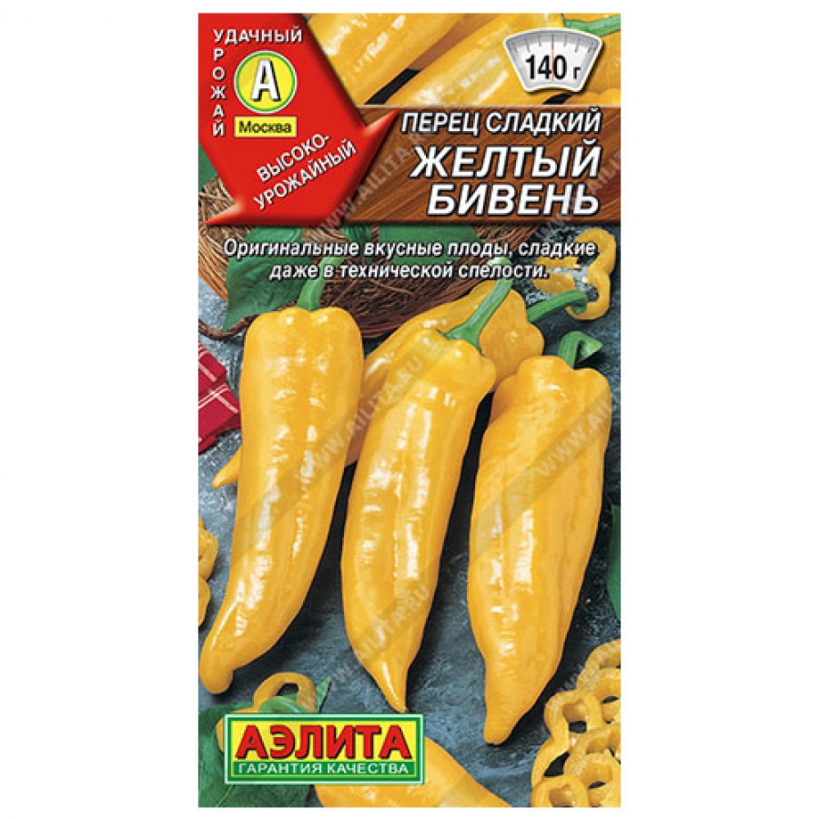 Среднеспелый сорт для пленочных теплиц, тоннелей и открытого грунта. От всходов до технической спелости – 95-100 дней, до биологической – 115-120 дней. Растения, высотой около 60 см, не требуют формирования. Плоды, длиной 20-25 см, шириной 5-6 см и массой 120-140 г, необычной формы, напоминают слоновий бивень. Толщина стенки 4-5 мм. В технической спелости окраска плодов зелёная, в биологической – ярко- желтая. Сочная мякоть с характерным перечным ароматом, богата витаминами группы В, А, РР, бета-каротинами и калием. Растения устойчивы к вирусу табачной мозаики. Урожайность в теплице 4-5 кг/м².