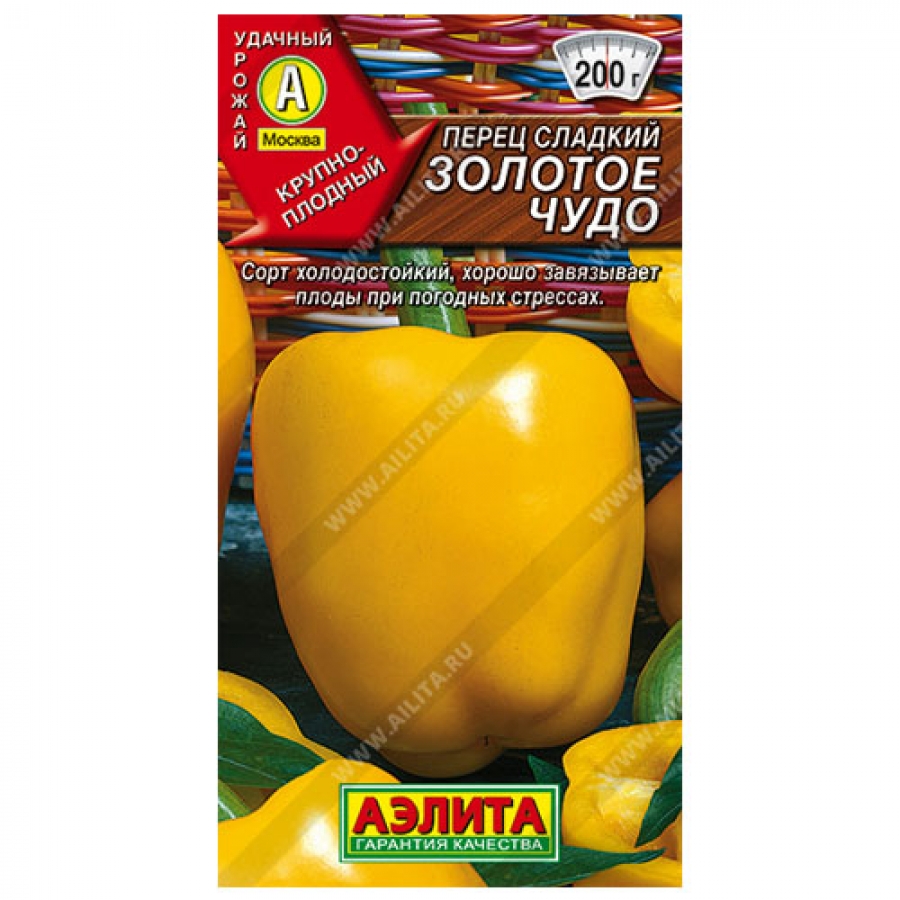 Среднеспелый сорт для открытого грунта и пленочных укрытий. Растения средней высоты, полураскидистое, с хорошей завязываемостью плодов. Урожайность товарных плодов под пленочными укрытиями 2,6 кг/м². Плоды мясистые (толщина стенки 7,0 мм), массой в среднем 185 г, призмовидные, 4-хгнездные, направлены вниз, созревают из темно- зеленых в технической спелости в темно-желтые в биологической. Рекомендуется для использования в свежем виде, домашней кулинарии и консервирования.
