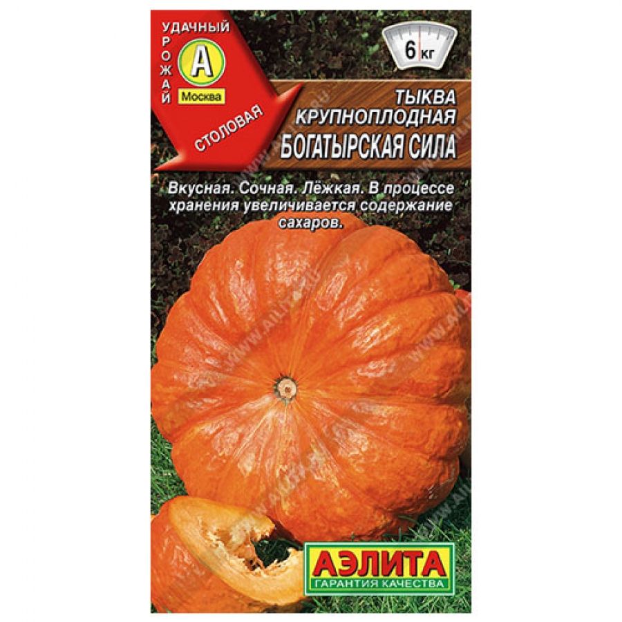 Столовый сорт с плодами высокого качества. Раннеспелый, от всходов до уборки около 100 дней. Растения длинноплетистые. Тыквины плоскоокруглые, слегка сегментированные (бороздки неглубокие), профили у плодоножки и вершины вдавленные. Средняя масса плода 4-6 кг, максимальная – до 15 кг. Кора кожистая, мякоть хрустящая, толстая, сочная. Семена крупные, белые. Плоды лежкие, хранятся до четырех месяцев. В процессе хранения увеличивается содержание сахаров. Мякоть обладает комплексом целебных качеств и очень вкусна в салатах, кашах, рагу, пирогах; используется на сок и пюре.
