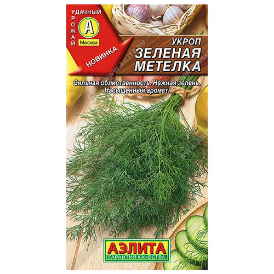 Новый сорт любимой многими пряной культуры с улучшенными характеристиками. Отличается повышенной ароматичностью и сильной облиственностью побегов. Первый урожай аппетитной зелени выборочно можно срезать уже через месяц после появления всходов. Чтобы из укропа заготовить на зиму душистые специи, уборку сырья проводят через 90-100 дней от всходов. При наступлении потребительской спелости розетка достигает высоты 30-40 см и состоит из 10-12 крупных листьев. К началу цветения растения вырастают до 1 м. Листья ярко-зеленые, восковой налет слабый. Преимущества сорта: нежная и сочная зелень, высокая урожайность, толерантность к мучнистой росе, длительная отдача продукции.