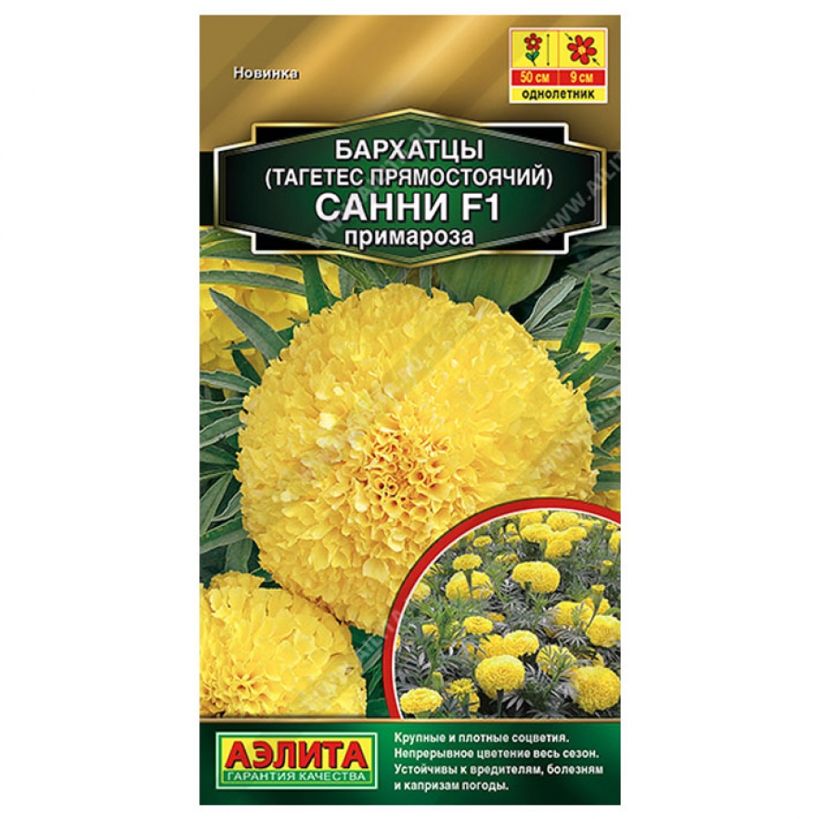 Гибрид с превосходными декоративными качествами. Махровые, по-настоящему крупные цветки достигают 8-9 см в диаметре. Бархатцы Санни F1 отличаются устойчивостью к болезням и вредителям. Серия ценится за простоту в уходе и непрерывное цветение на протяжении всего сезона. Растения среднерослые, высота* крепких, прямостоячих побегов до 40-50 см. Боковые стебли обеспечивают компактным кустикам аккуратную форму. Соцветия плотные, после дождя и полива влага не скапливается в основании лепестков. Цветки долго сохраняют яркость, свежесть и опрятный вид. Серия рекомендована для украшения клумб, бордюров, вазонов и букетов.