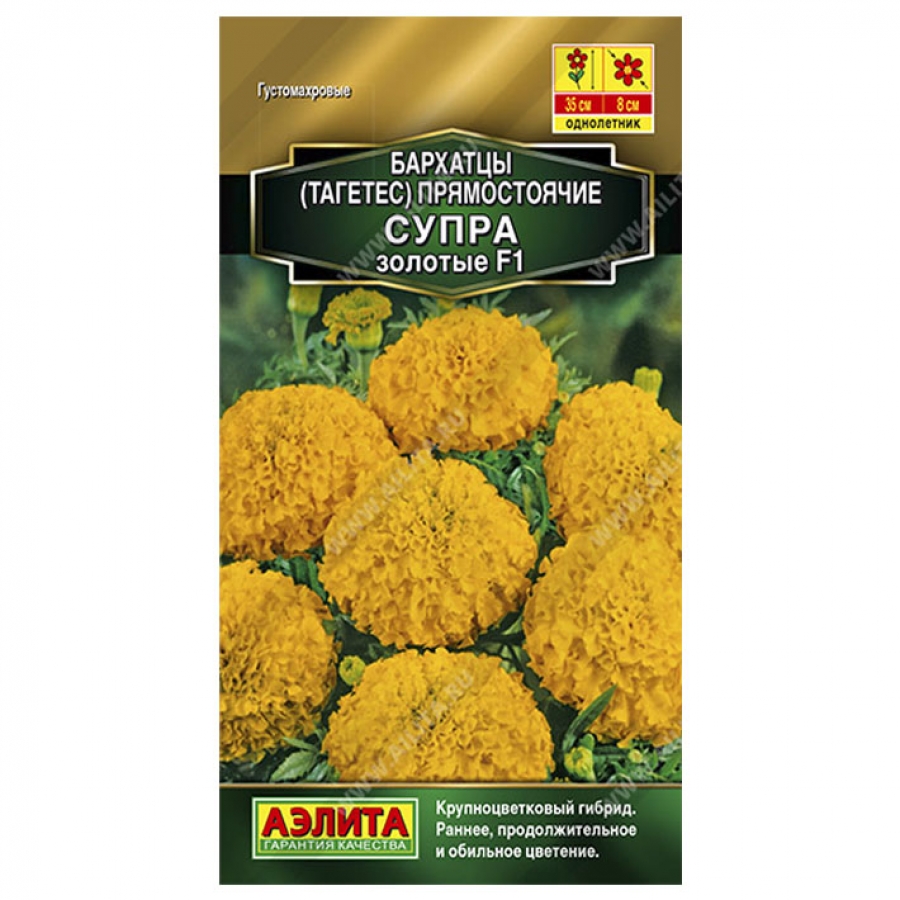 Гибрид бархатцев из серии СУПРА F1 с улучшенными декоративными качествами. Цветение очень раннее и обильное, продолжается с начала лета до первых заморозков. Соцветия густомахровые, крупные (Ø 7-9 см), отлично переносят воздействие дождя и ветра сохраняя форму и цвет. Кустики пышные, сильноветвистые, высотой 30-35 см, с большим количеством цветоносов, отличаются выравненностью и компактностью. Растения холодостойкие, неприхотливые к почвам. Великолепно подходят для выращивания в горшках и балконных ящиках, на клумбах, в бордюрах и цветниках.
