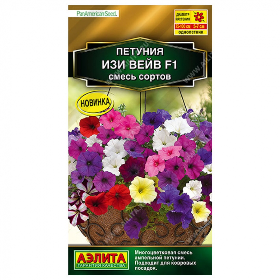 Знаменитый ампельный гибрид с обильным цветением от американской компании PanAmerican Seed. Серия Изи вейв F1 принадлежит к группе многоцветковых петуний. Растение формирует цветущий «купол» высотой* 20-25 см над кашпо и интенсивно наращивает плети длиной 75-100 см. В ландшафтном варианте образует сплошной красочный ковер высотой* 15-30 см, в зависимости от расстояния между кустами. Цветки имеют нежный фиалковый аромат. При контейнерном выращивании необходимо обеспечить не менее 7-8 л грунта на одно растение. В смеси преобладают красные, пурпурные и розовые оттенки, могут встречаться белый и лимонный цвета.